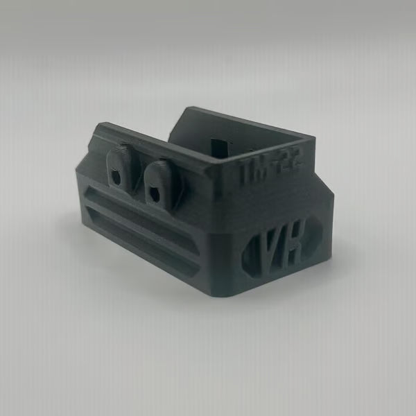 This Magwell flare for the TM-22 V2 is designed to improve magazine insertion and provide a smoother reloading experience. It enhances the Magwell's shape, allowing for quicker, more efficient magazine swaps. The V2 version is more durable, 5 grams lighter, and cosmetically better, while maintaining the same functionality as the original. Installs by clamping 4 set screws to the receiver with a spacer in-between so it will not damage your finish!